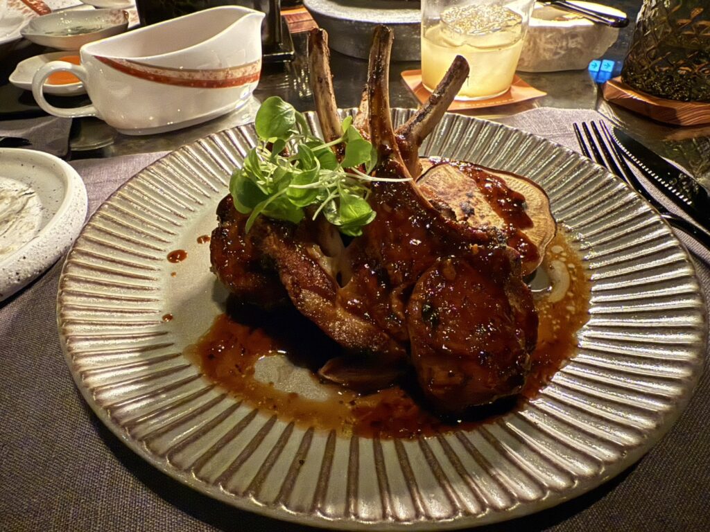メインには、「オーストラリア産ラムチョップ 紫蘇とミントのチミチュリ」と「東京和牛ハンバーグ バターライス グレイビーソース」を。ラムチョップは炭火の香ばしさとジューシーな旨味が印象的。さつまいものグリルの自然な甘みも、味わいに変化をもたらします。
