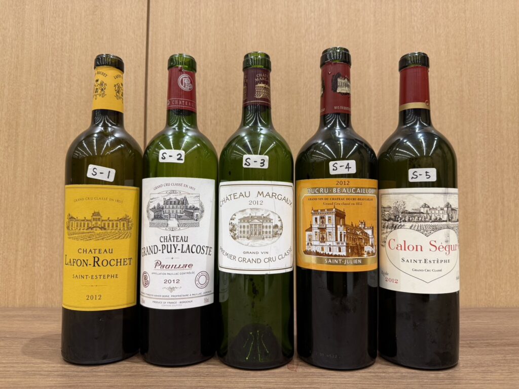 | 8 問題&正解 | 5つのメドック格付け(1~5級、同ヴィンテージ)ワインをテイスティング(制限時間2分半) ①どれが1級でしょう。 ②1級シャトーの銘柄を答えてください。 ③1級から5級に並び替えてください。 |