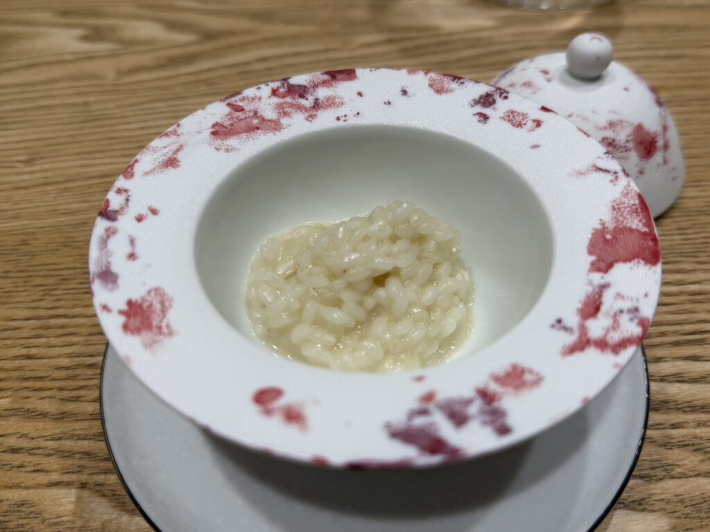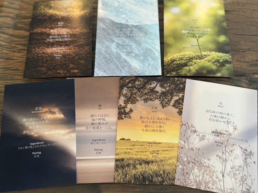 各皿にはコンセプトカードが添えられており、「地層」「雫」など、その料理のテーマとなる言葉とともに、食材やペアリング日本酒が記されています。料理を味わう前にその言葉を目にすると、どんな味わいなのだろうと想像が広がり、一皿ごとの世界観を感じながらコースを楽しむことができました。
