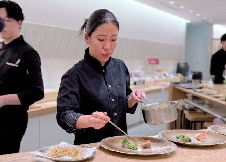 今回の主役は、固定店舗を持たず、さまざまな場所で料理を生み出してきた一之瀬愛衣シェフの料理と、入手困難なプレミアム日本酒として知られる「SAKE HUNDRED」。空港という舞台ならではの、空輸された朝採れ食材を使い、SAKE HUNDREDの日本酒とのペアリングを軸にした特別コース。その様子をご紹介します。