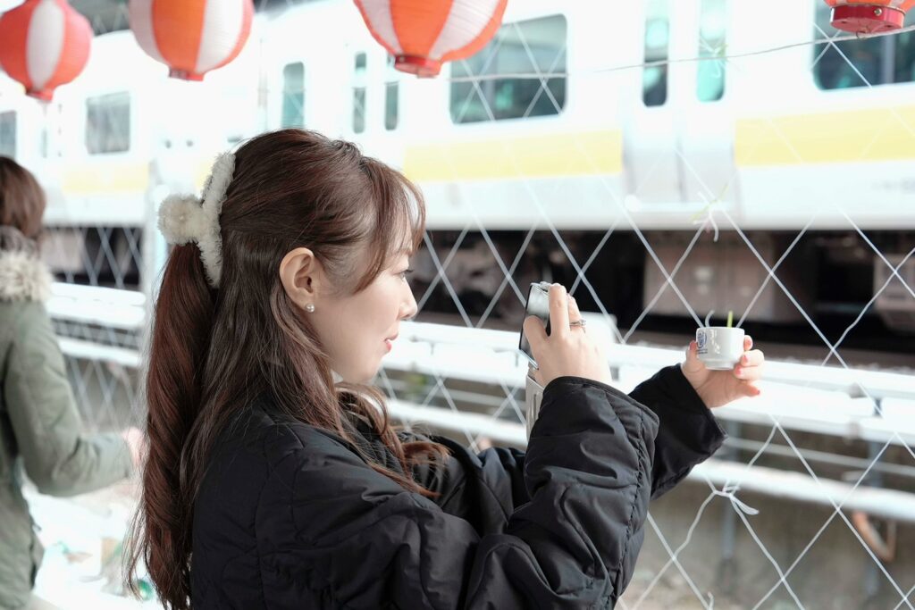 すぐ目の前を行き交う電車を眺めながら、熱燗とアツアツのおでんを立ち飲みスタイルで楽しめる、ちょっと非日常な体験が用意されています。