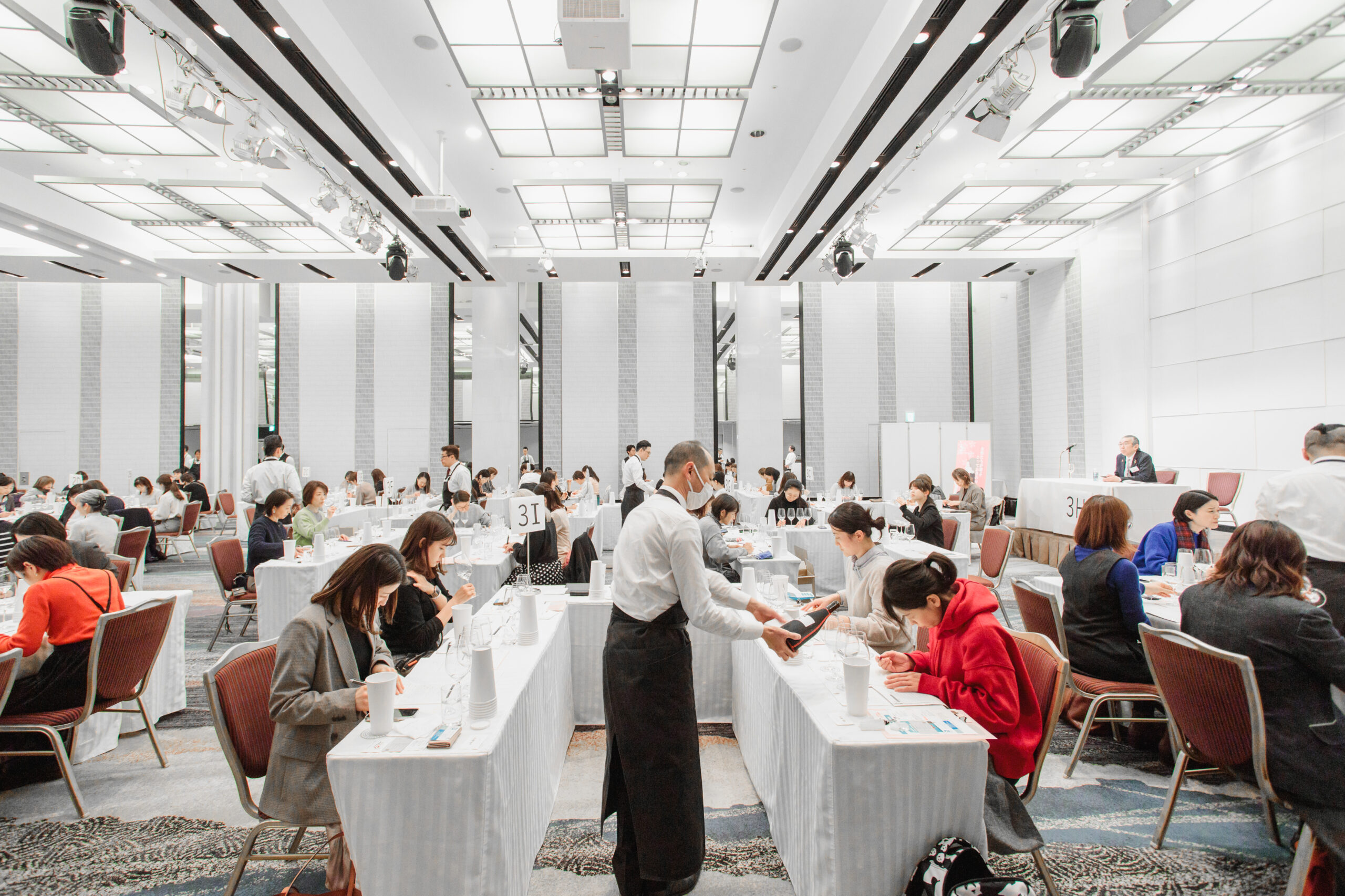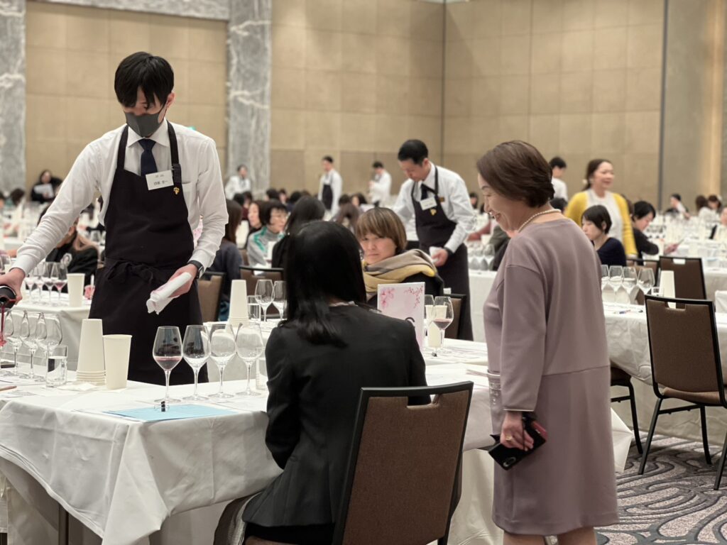 広い会場には多くのテーブルが並び、審査は滞りなく進められている様子でした。集中して審査を行っているグループもあれば、休憩に入っているグループもあります。静かな会場の中で、控えめな談笑が交わされる和やかな雰囲気が印象的でした。ワインをサーブするソムリエは男性が中心で、審査が円滑に進むよう支えている様子がうかがえました。