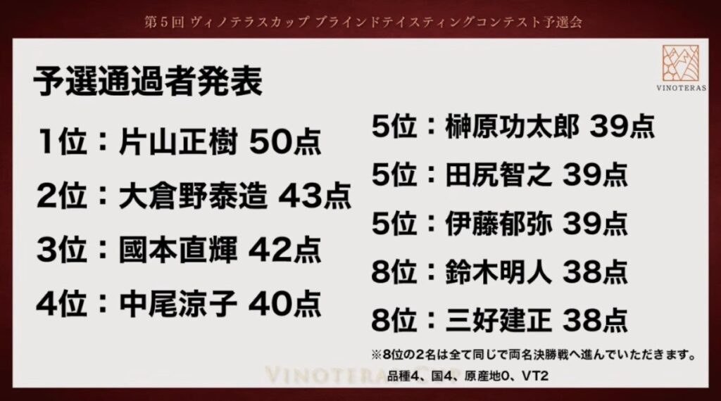 今回、予選を通過された、1位:片山正樹さん、2位:大倉野泰造さん、5位:田尻智之さん、8位:鈴木明人さんはいずれもヴィノテラスが運営するYouTubeチャンネル「Blind Wine Tasting」に出演されている、数々の大会で実績を持つ実力者です。